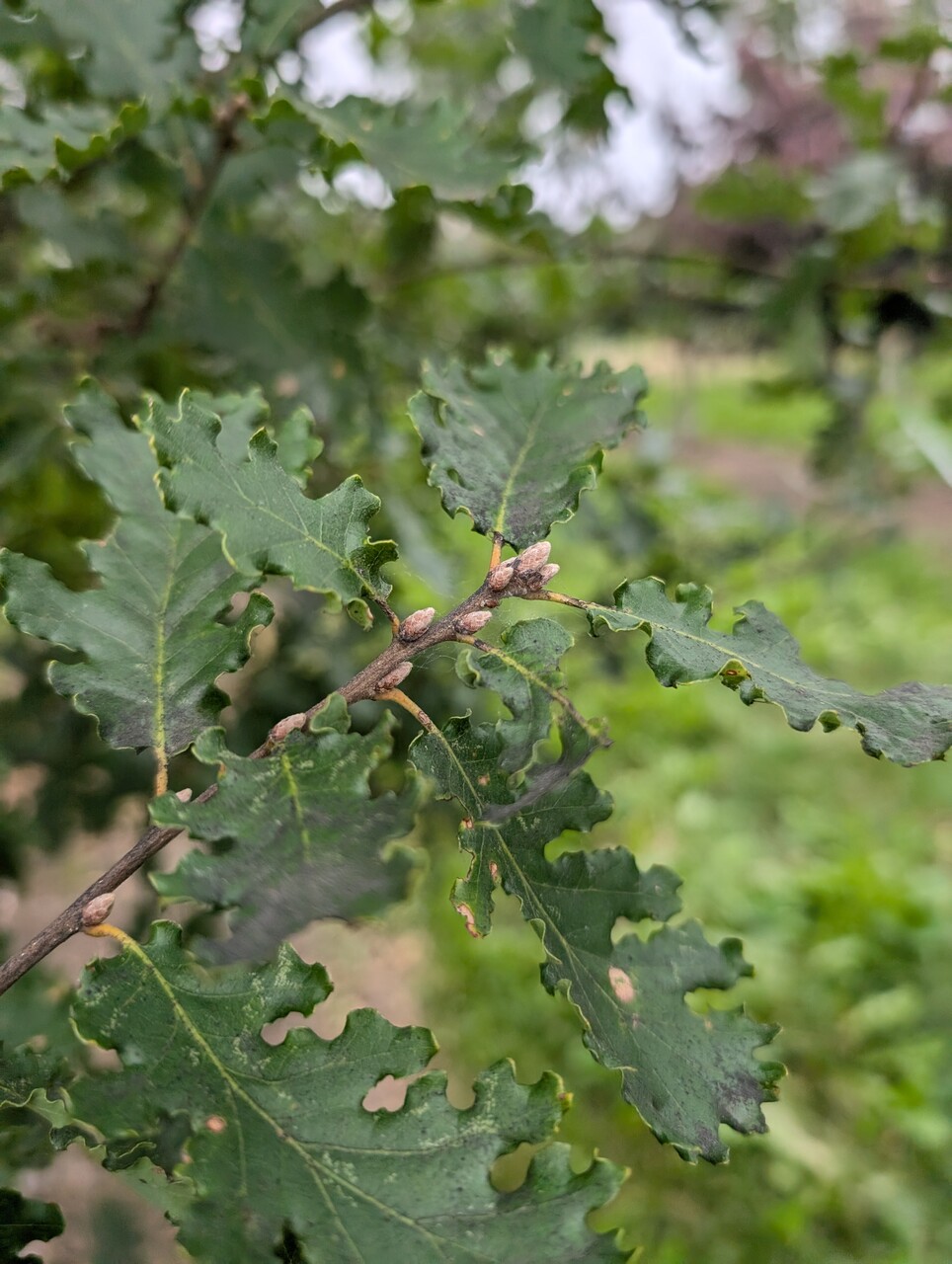 Occurs naturally in warm sunny regions on moist calcareous mountainsides. There it sometimes attains a height of up to 20 m. When cultivated, Q. pubescens is grafted onto Q. robur and remains smaller. The grey trunk has deep cork-like grooves. The buds and young twigs are covered in soft felt-like hairs. The leaves vary in shape: obovate to elliptical. Length 5 - 10 cm, width 3 - 5 cm. The underside of the leaf is also covered in soft hairs. The leaves are irregular, mostly with shallow lobes. The lobes are sometimes rounded off bluntly, sometimes pointed. The leaves somewhat resemble those of Q. robur but remain considerably smaller. The acorns are grouped in twos and fours and are half enclosed by the cupule: the latter is covered with contiguous scales that carry felt-like hairs.