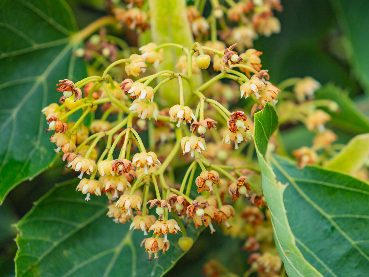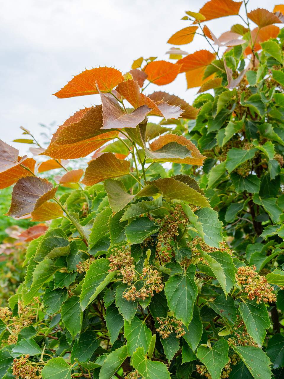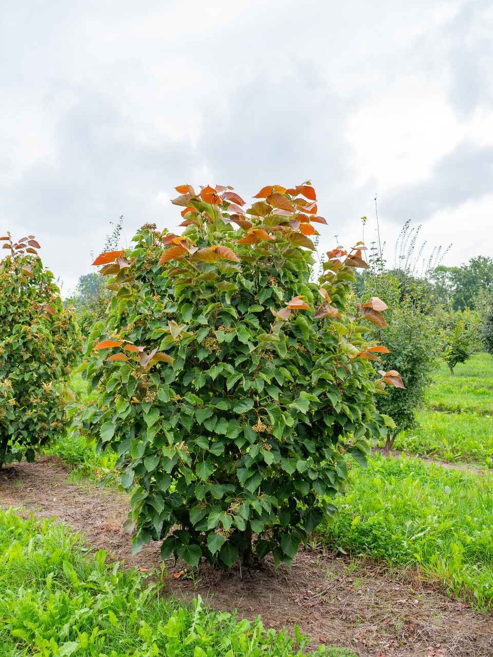 'Arnold Select' is a small to medium-sized tree with a dense, broad oval crown. The tree grows very regularly and clearly more stocky than the species T. henryana. The most striking feature of T. henryana, and therefore also of 'Arnold Select', is its beautifully shaped leaves. This is broad ovoid to heart-shaped with serrate leaf margins where each vein ends in a soft tooth along the leaf margin. The young foliage is pinkish-bronze. The adult leaves are dark yellow-green. The flowers appear in pendulous corymbs and are yellowish-white. When the tree flowers in summer, it attracts many insects.