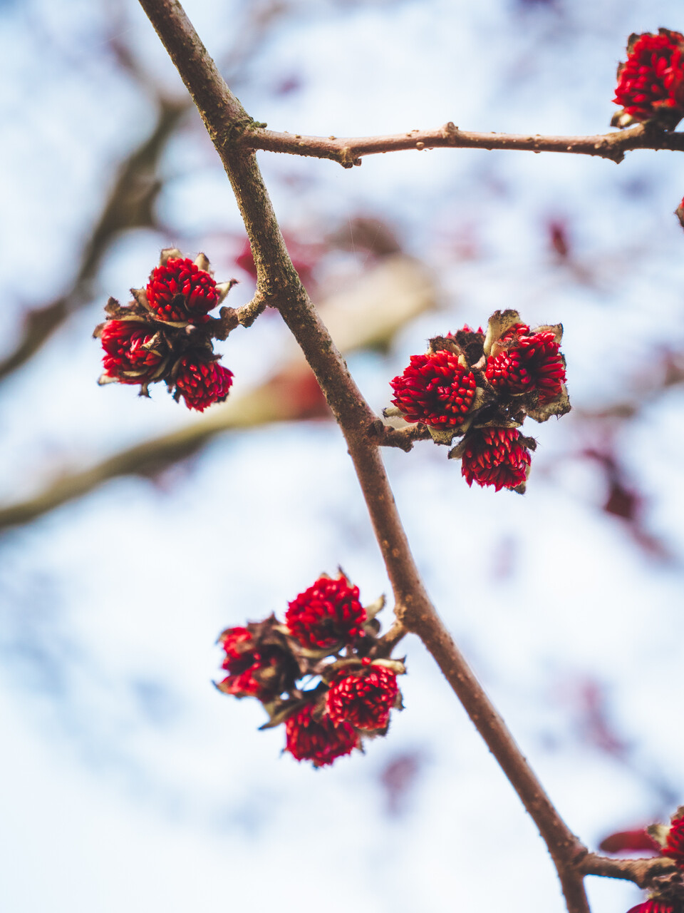 Usually a shrub with branches starting at ground level, growing to become a medium-large tree with a spreading, irregular branching pattern. Sometimes also cultivated as a high stemmed tree. The trunk is light grey with purplish brown spots and has flaking bark plates. This is especially decorative in more mature trees. Young twigs have remarkable lenticels. The glossy leaf is dark when it emerges and usually has a slanted shape, with the top half of the leaf edge undulating irregularly. The main decorative value is the autumn colours of red, yellow and purple. Mainly older specimens bloom. The flowers are about 2 cm big and are striking due to the bright red anthers. The bare shrub is spectacular when in full bloom. After flowering, 1-cm spiked brown fruit appears. The tree has a fine root system close to the surface.