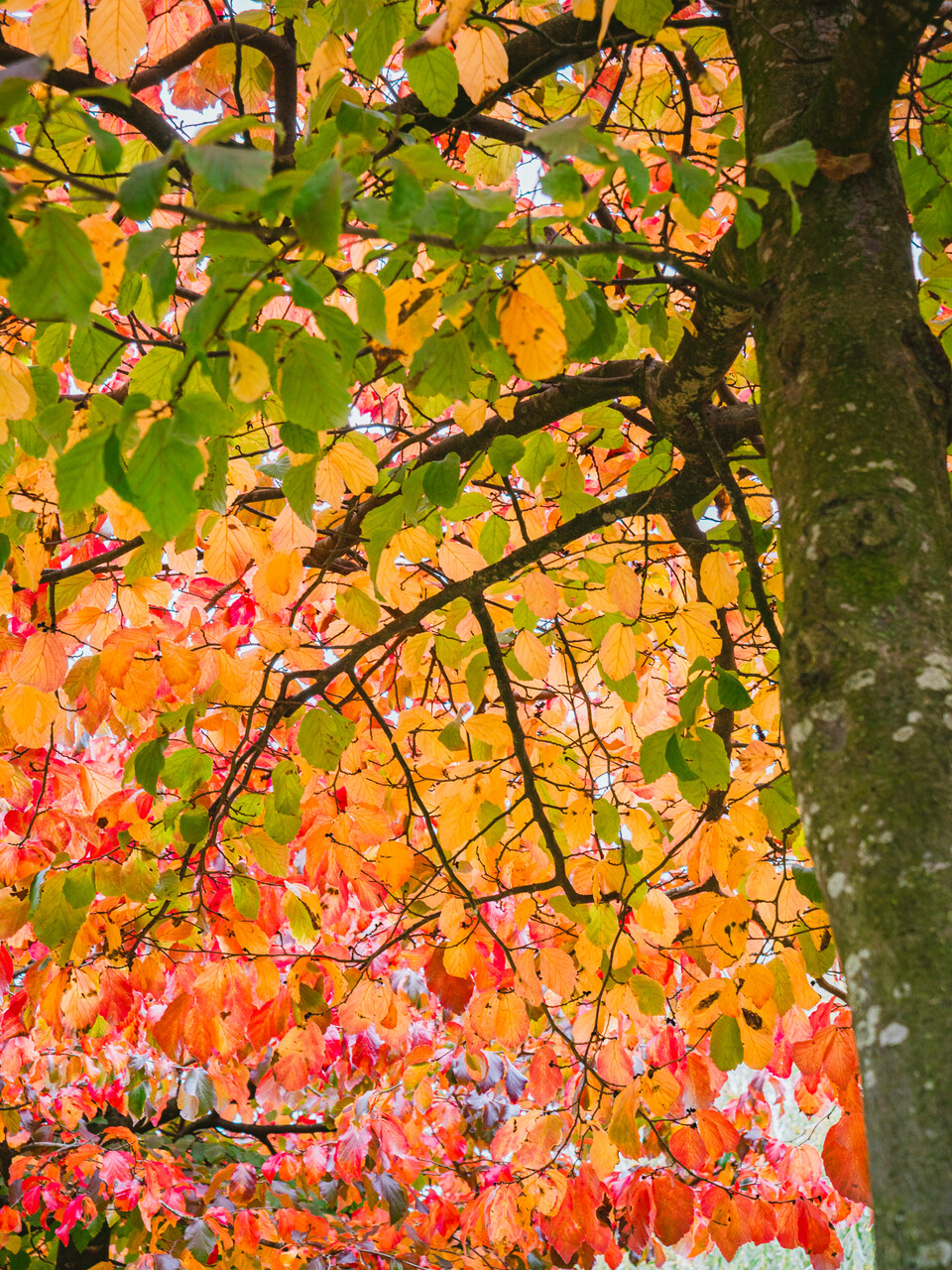 The leaves of Parrotia persica turn желтый, оранжевый, красный, пурпурный in autumn.