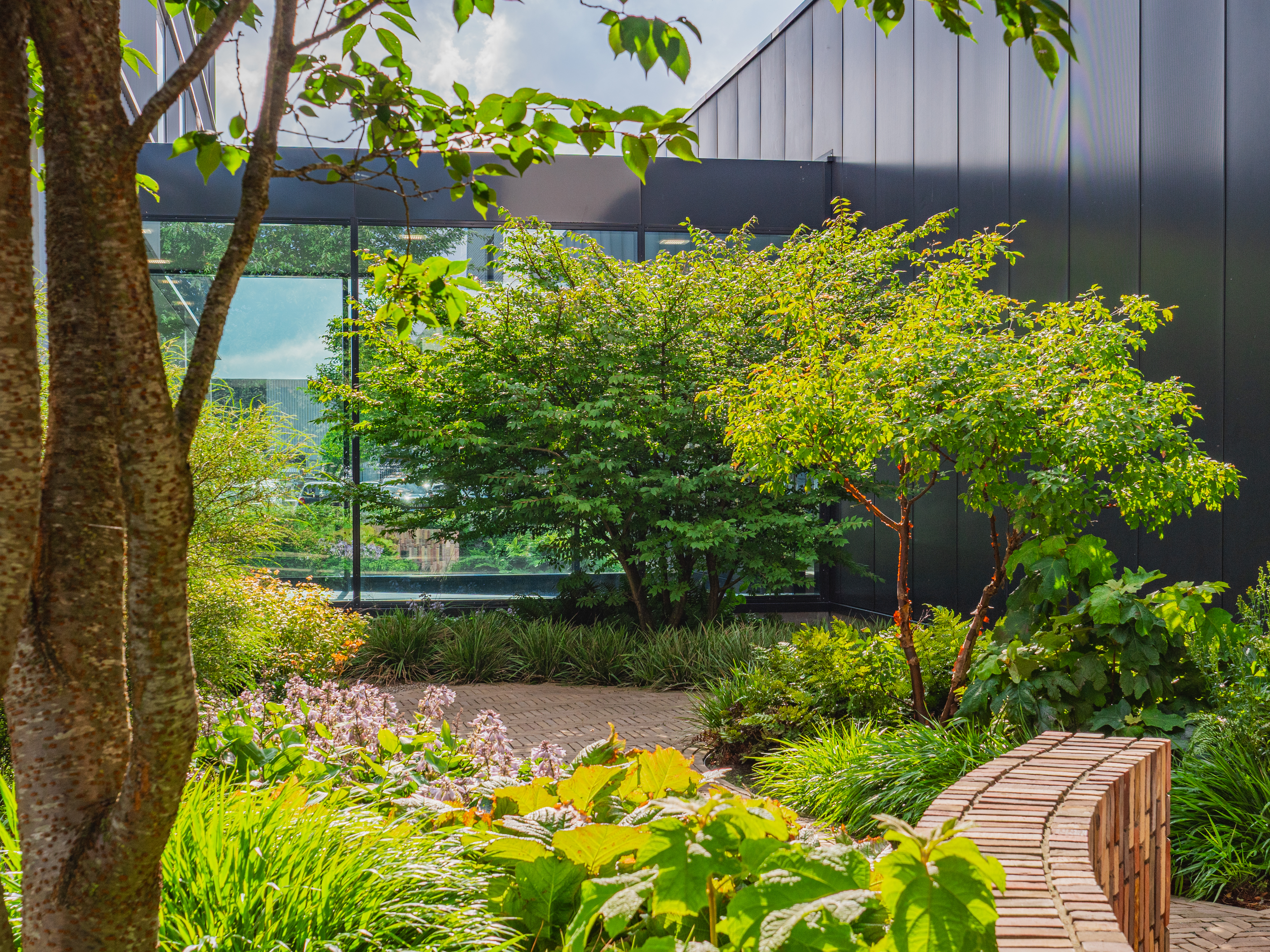 Весной Prunus 'Accolade' окрашивает территорию в розовый цвет: на ещё голых ветвях распускаются крупные полумахровые цветки, ещё до распускания листьев. Amelanchier lamarckii в это же время цветёт белым и осенью становится оранжево-красной. Acer griseum выделяется тонкой, отслаивающейся корой цвета корицы и ярко-красной осенней листвой. Zelkova carpinifolia 'Verschaffeltii' формирует широкую вазообразную крону с мелкозубчатым листом, отличается выносливостью и нетребовательностью. А Pinus sylvestris придаёт композиции структуру зимой, когда остальной ассортимент стоит без листвы.